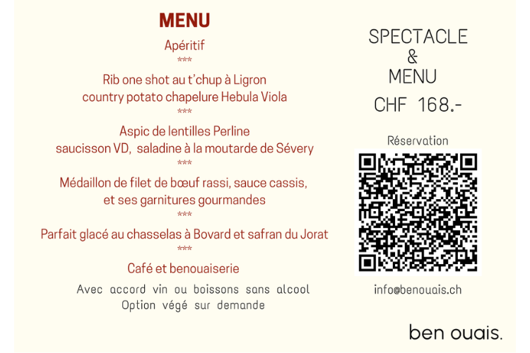 Le 3 octobre 2025, 18h30 à l'auberge-épicerie ben ouais Corcelles-le-Jorat, réservez votre table pour un événement gastronomique.