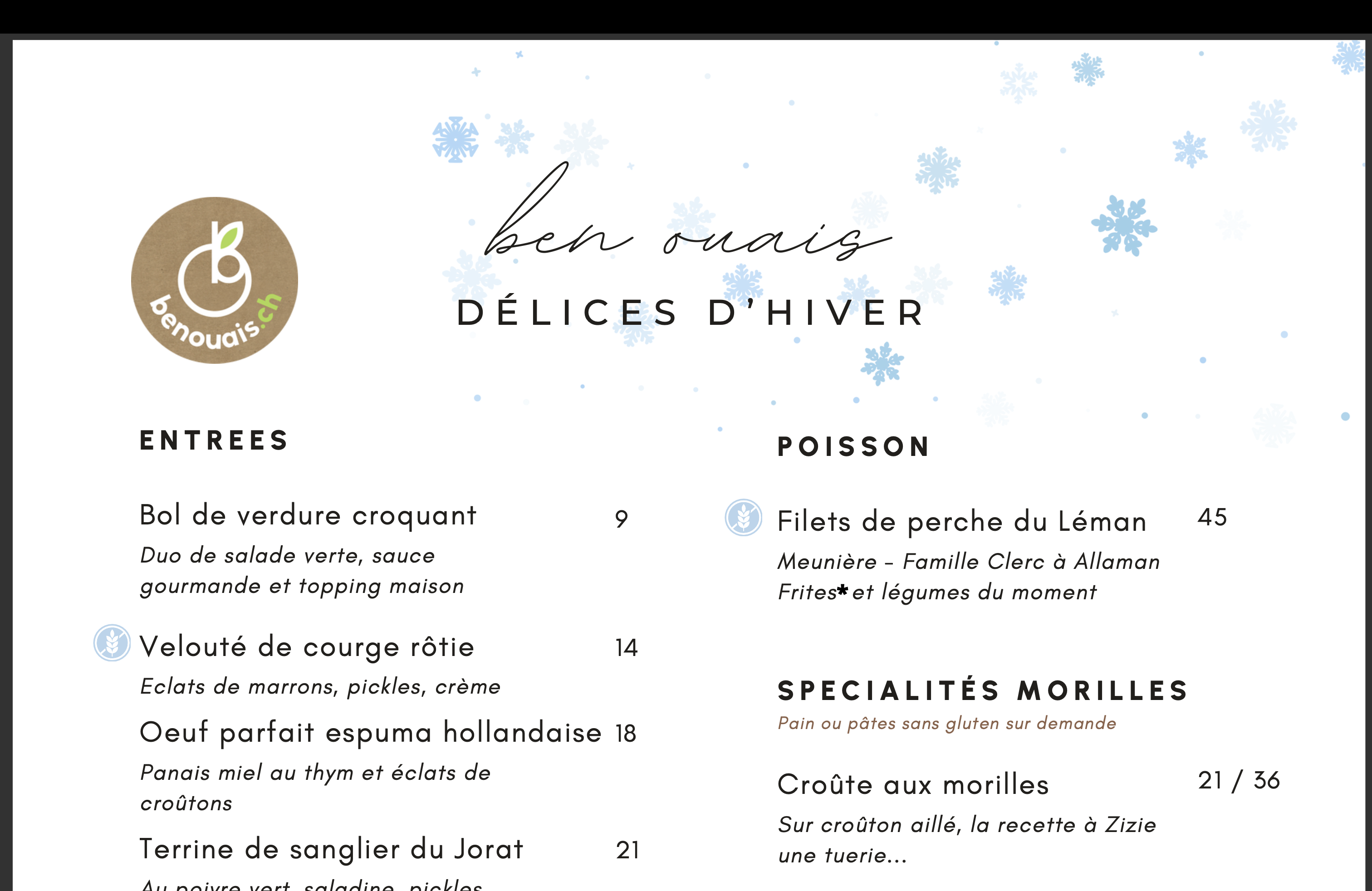 Simple réservation : info@benouais.ch ou par tél. 021 903 34 30